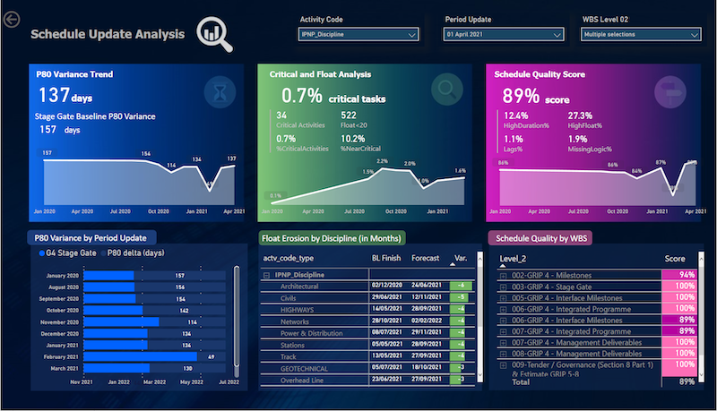 And finally, you can also use Data Visualization techniques on the rise in the Project Controls industry. Imagine having a dynamic & interactive Schedule KPI dashboard that allows you to dig down the details and figure out the issues. For example, check the Schedule Update Analysis dashboard created by Power BI in Fig. 8 below. Instead of manually copy-pasting spreadsheet data and crunching numbers, Power BI automates the process by linking directly to the source data.
